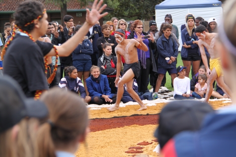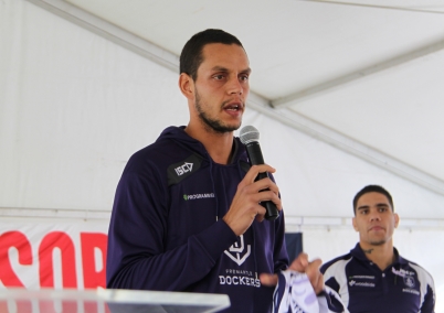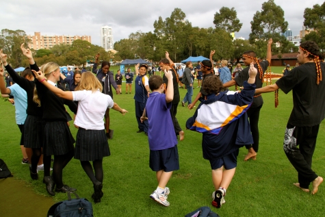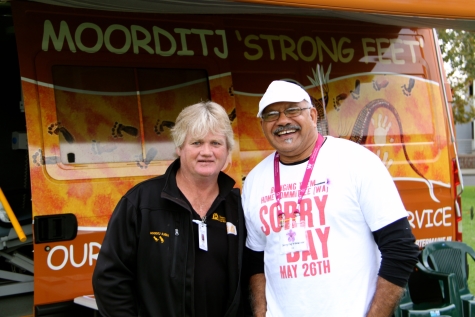 The day’s events commenced at 9.30am with a Welcome by representatives from ICEA and AIME. In excess of 1000 schoolchildren then took part in a large range of activities that included everything from painting, poetry, Aboriginal dance, poetry writing and sports. School events finished with a mass corroboree on a massive sand mural that had been created adjacent to the marquee. The formal proceedings commenced at 12.30pm with a Welcome to country by Rev. Sealin Garlett and then the The Bringing Them Home Committee Co-Convenors, Jim Morrison and Alan Carter welcomed everyone to Sorry Day. We asked Michael Johnston and Michael Walters from the Fremantle Dockers to present the prizes to the winners of the school competition in poetry, writing and photography.